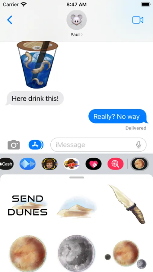 Do you love dunes in space with spice? My scifi desert friend, these original artwork stickers are hand crafted for you. Turn your friends into desert people with blue eye stickers and nose plugs. Enjoy a mind-numbing sandworm boba, or a whole waterskin of blue life giving water. Show off your signet ring so people know you're the duke now.