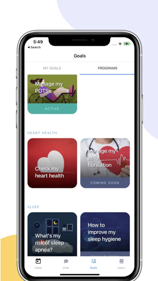Goals are a bit like Activity Rings -- but customized to your own unique health goals. For example, people with POTS can track salt intake, water, medication, and recumbent exercise. You can configure customized rest days. We have programs for cardio health (heart analyzer), sleep apnea, general exercise & fitness, and POTS.