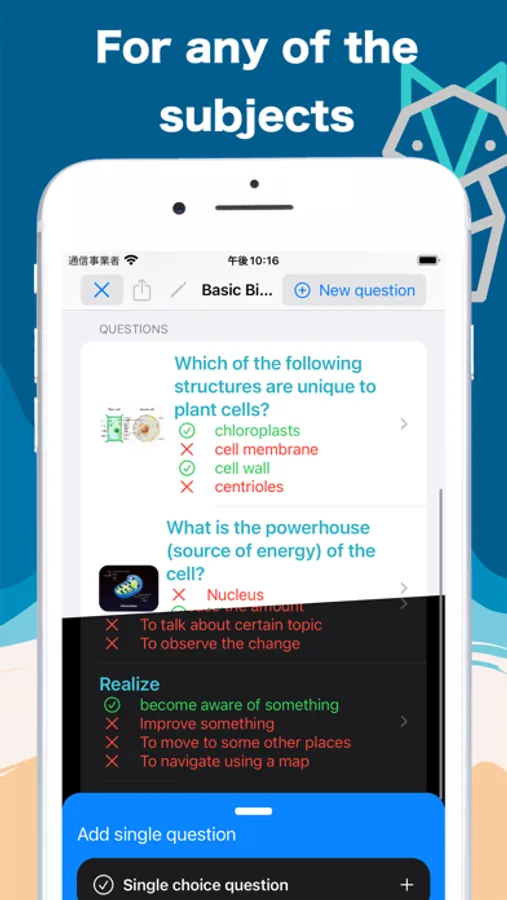 You can use this app for any subjects, like English, Biology, and many others. You can type the question, scan them, or ask AI to generate some.