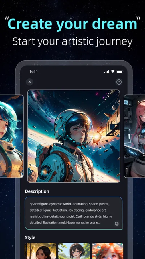 Mirage AI Art uses the most advanced AI V5 model to drawing portraits, providing dozens of colorful painting styles. It is easy to use, just enter the keyprompt description, you can quickly generate the art and painting works you want, and turn your imagination into reality.