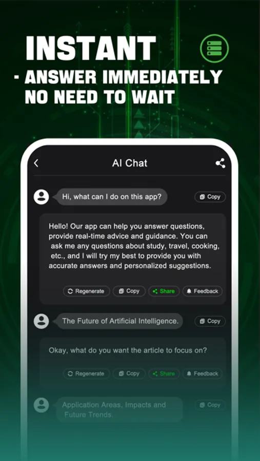 State-of-the-art human intelligence technology understands your questions and generates human-like responses. Therefore, when you chat with AI Chat, you will feel like chatting with friends, just like chatting with a knowledgeable friend. AI Chat can recommend enough books to read or movies to watch, bringing more entertainment to your life.