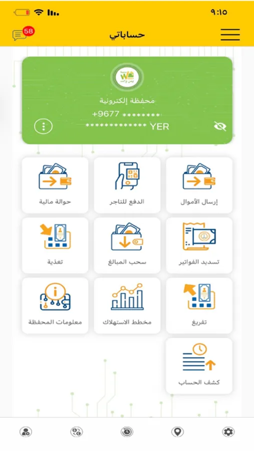 It is an electronic financial service that enables the customer to perform all transactions such as Top- up and Cash in /Cash out via mobile , Transfer and Receive money, bills payment, WALLET to Account & Account to Wallet , Bill Payment All invoice for Postpaid or Prepaid like Top-up or E-voucher , pay all the obligations purchases .