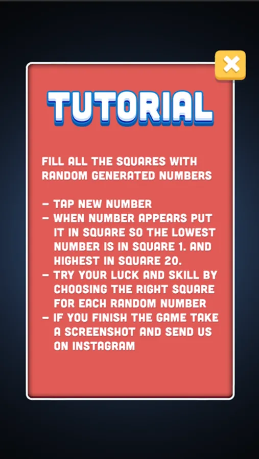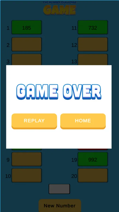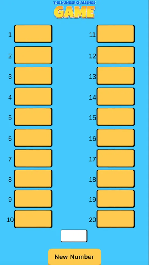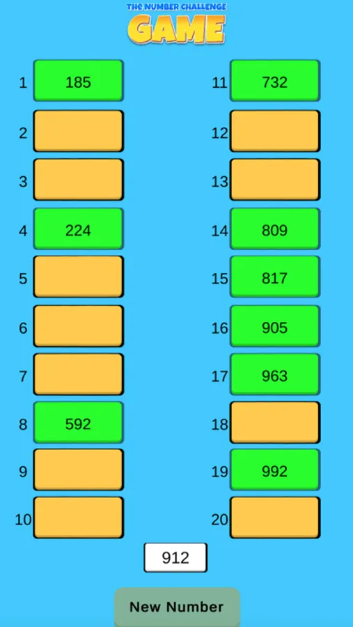 Introducing "The Number Challenge Game" for iOS, an addictive and brain-teasing experience that will put your numerical skills to the test! Get ready to embark on a thrilling journey of order and logic, where your goal is to place randomly generated numbers in the correct squares from 1 to 20. With its simple yet captivating gameplay, this game guarantees hours of challenging fun. At the bottom of the screen, you'll find a constantly changing, randomly generated number between 0 and 999. Your task is to quickly analyze the number and strategically place it in the corresponding square. Let's say the first random number is 256. With your logical thinking, you instinctively place it in the 5th square. As you press the "New Number" button, the game generates another number, such as 769. Applying your deductive skills, you correctly position it in the 17th square. The true test lies in placing all the numbers in their precise order. Each time a new number appears, you must think on your feet, making split-second decisions to ensure that the numerical sequence remains intact. Challenge your memory, speed, and accuracy as you strive to complete the puzzle within the given time limit. With its clean and intuitive interface, "The Number Challenge Game" provides a seamless gaming experience for players of all ages. Sharpen your mathematical prowess, enhance your cognitive abilities, and track your progress as you strive for perfection. Are you ready to conquer the ultimate numerical challenge? Download "The Number Challenge Game" now and put your logical skills to the ultimate test! Can you achieve the perfect sequence and become the master of numbers?