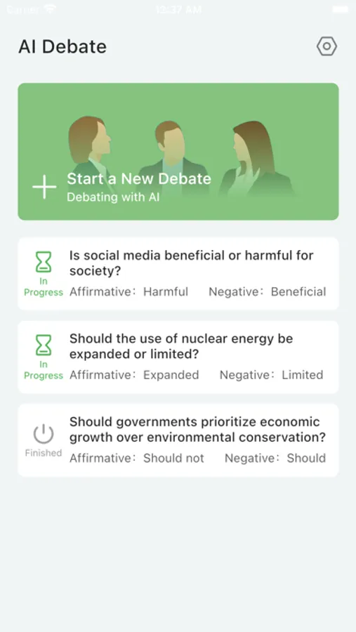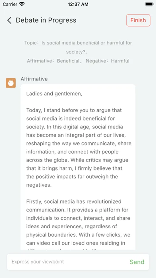 Debate competitions not only expand students' extracurricular knowledge but also enhance their thinking and language skills. However, organizing a debate competition is a demanding and time-consuming task. This app utilizes the GPT model and introduces AI as your opponent, allowing you to debate with AI anytime and anywhere. AI possesses logical reasoning, fast debating speed, and knowledge equivalent to that of excellent debaters, enabling you to quickly improve your thinking and language skills. Download and experience it now!