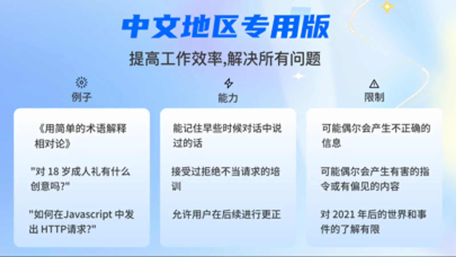 您可以与人工智能机器人对话互动,让他回答问题,协助创作,帮助您获取信息、知识和灵感。
