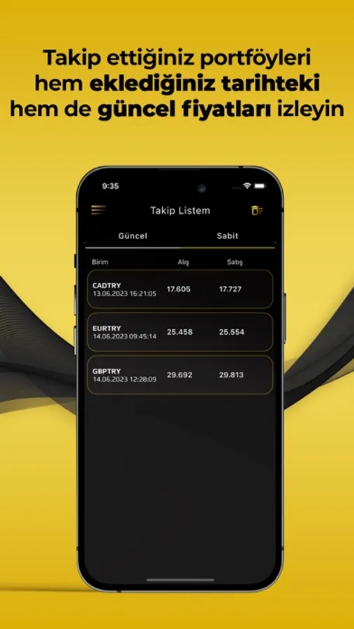 Dilediğiniz kur için alarm kurun, takip listenize güncel veya sabit seçenekleri ile ekleyin.