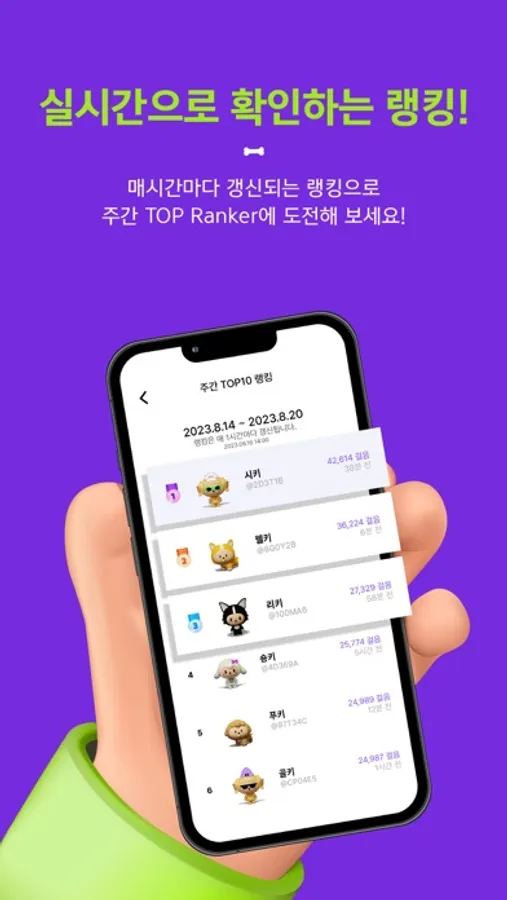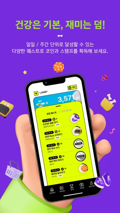 - 일일 / 주간 단위로 달성할 수 있는 다양한 챌린지를 통해 워키 성장에 필요한 코인과 스탬프를 듬뿍 담아 주세요.