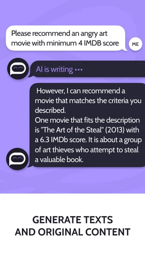 Choose from a variety of tasks and topics and use convenient prompts to quickly get things done and make your life easier. You will always be able to send a personal request to your AI to fulfill your needs or simply use a compilation of the most popular requests to always stay in tune with the trends.