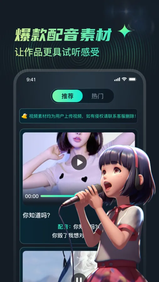【多种优质素材】提供多种类型的配音素材,可任意选择自己喜欢的视频进行配音体验。