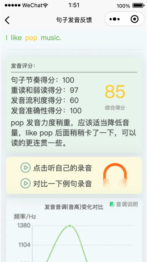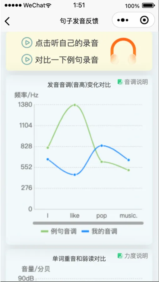 【句子发音纠正】本软件可以从节奏,语音语调,重读和弱读,流利度和发音准确性等多方面给用户的口语句子打分,并且会用图表的形式,在 发音音调,重读和弱读,和每个单词发音时长 三个方面,让用户知道自己发音和标准例句发音区别在哪里,可以让用户有一个改正发音的方向。