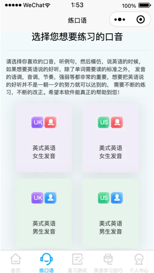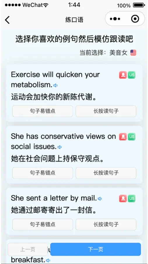 【英式英语和美式英语】本软件的所有例句都是分类好了四种:英式英语女生读的,英式英语男生读的,美式英语女生读的,美式英语男生读的,这样用户可以选择自己想要学习的口音去模仿,然后模仿阅读之后,本软件会告诉用户和标准例句差在哪里,给用户一个努力的方向。