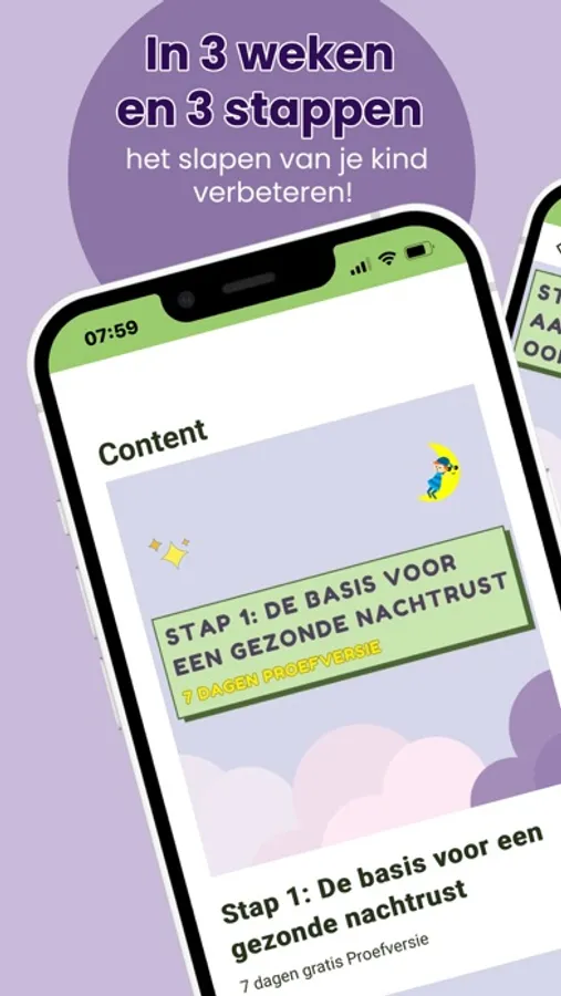 Schrijf je in voor toegang tot functies zoals waak/slaapdagboek, slaapplan en community. Probeer de app geheel vrijblijvend. De 1e stap 7 dagen gratis.