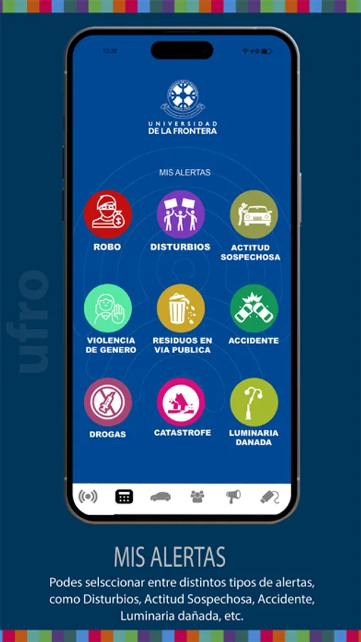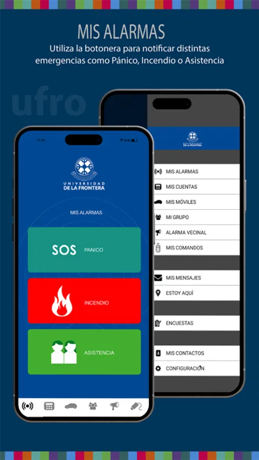ALERTA UFRO te permitirá reportar en forma inmediata situaciones de emergencia, asistencia o incendio informando tu localización exacta a la central de monitoreo UFRO. La situación de emergencia se puede complementar con imagen y video, será derivada a la unidad correspondiente y gestionada a la brevedad.
