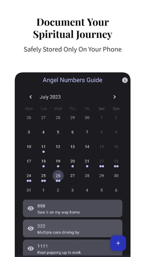 Discover patterns and deepen your spiritual connections with our "Insights" feature. By documenting the frequency of your angel number encounters, you can retrospectively analyze these divine messages. Uncover recurring themes and unveil the narrative of your spiritual journey, enhancing your understanding of the guidance from the angelic realm.
