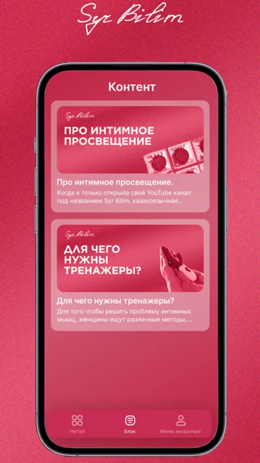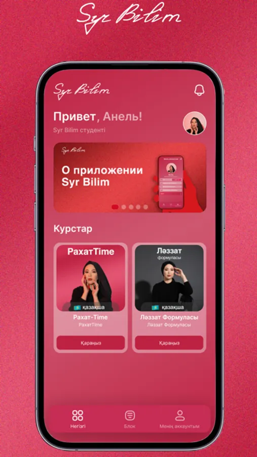 Syr Bilim - mobile application of Anel Nurzhaubayeva. This app includes courses and lessons and many other functions. You can use this app in 2 languages (Kazakh/Russian)