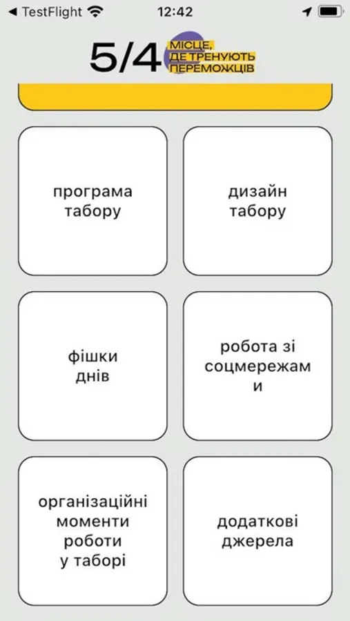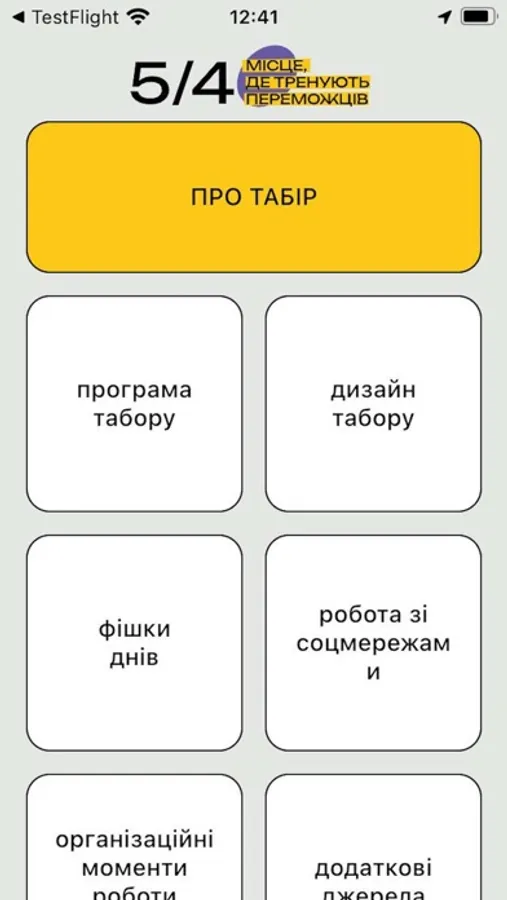 В цьому додатку зібрана програма табору під назвою "5/4 Місце де тренують переможців".