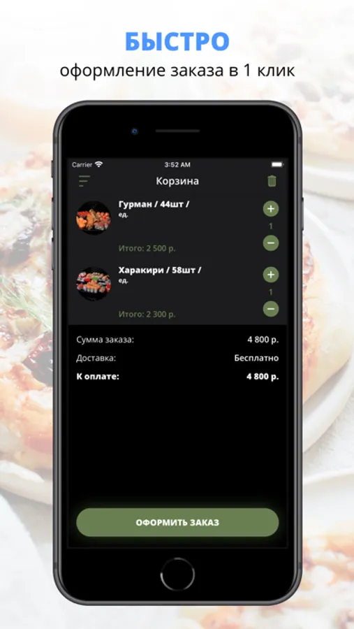 Установите приложение, выберите любимые блюда из нашего меню и оформите заказ всего в несколько кликов! С помощью мобильного приложения сможете получать и копить бонусы, отслеживать статус заказа, выбрать удобный способ оплаты и быть в курсе всех акций и новостей!