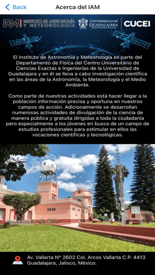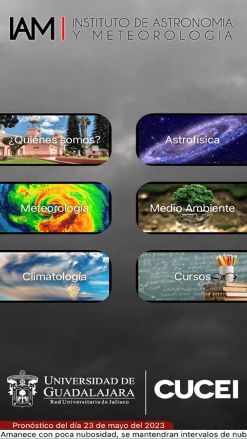 El Instituto de Astronomía y Meteorología del Centro Universitario de Ciencias Exactas e Ingenierías pone a su servicio la Aplicación IAM para brindarte información meteorológica, astronómica, climatológica y del medio ambiente.