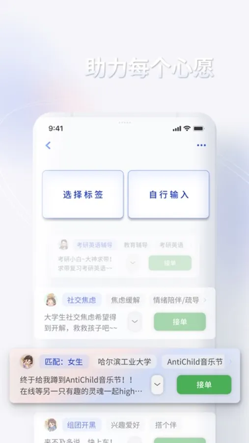 用户可以在上面提出自己需求,平台帮他匹配到适合帮他解决需求/搭伴匹配的其他用户,让双方以一对一的视频方式,交互解决需求|完成匹配。