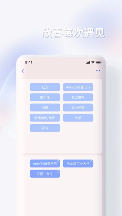 喜见APP是一个以需求为纽带的匹配社交平台,我们致力于给学生、内容创作者以及热爱生活与社交的上班族提供解决方案。用户可以在喜见上高效解决需求与实现自身价值帮助他人,也可以在喜见上搭伴匹配,找到当下需要的用户,一同完成双方的活动需求。