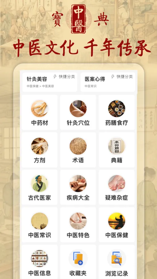 【详细分类】中医宝典将内容细分为多个分类:疾病大全、疑难杂症、中医常识、中医特色、中医保健、中医信息、中药材、针灸穴位、药膳食疗、方剂、术语、典籍和古代医家等。