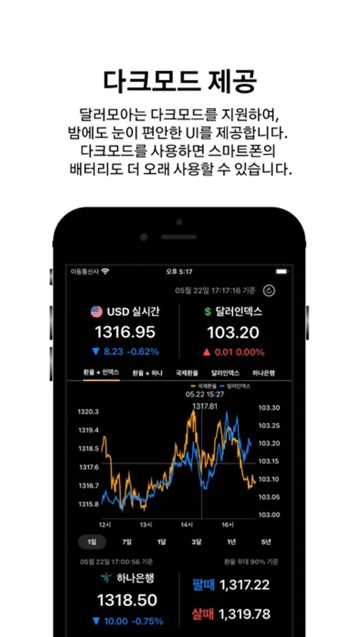 다크모드 지원: 달러모아는 다크모드를 지원하여, 밤에도 눈이 편안한 UI를 제공합니다.