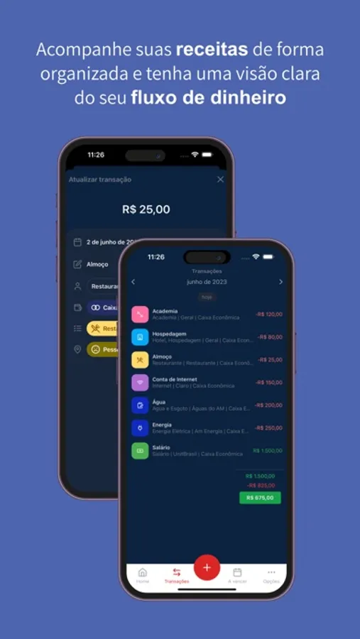Controle Despesas e Receitas: Registre suas despesas e receitas de forma simples e organizada. Categorize seus gastos, adicione notas e acompanhe o fluxo do seu dinheiro. Tenha uma visão clara das suas finanças para tomar decisões informadas.