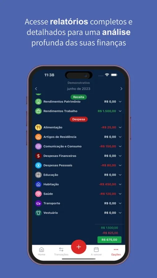 Relatórios Detalhados: Acesse relatórios completos e detalhados para entender melhor sua situação financeira. Analise suas despesas, receitas, saldos e compare com períodos anteriores. Com gráficos e estatísticas intuitivas, você terá uma visão abrangente de suas finanças.