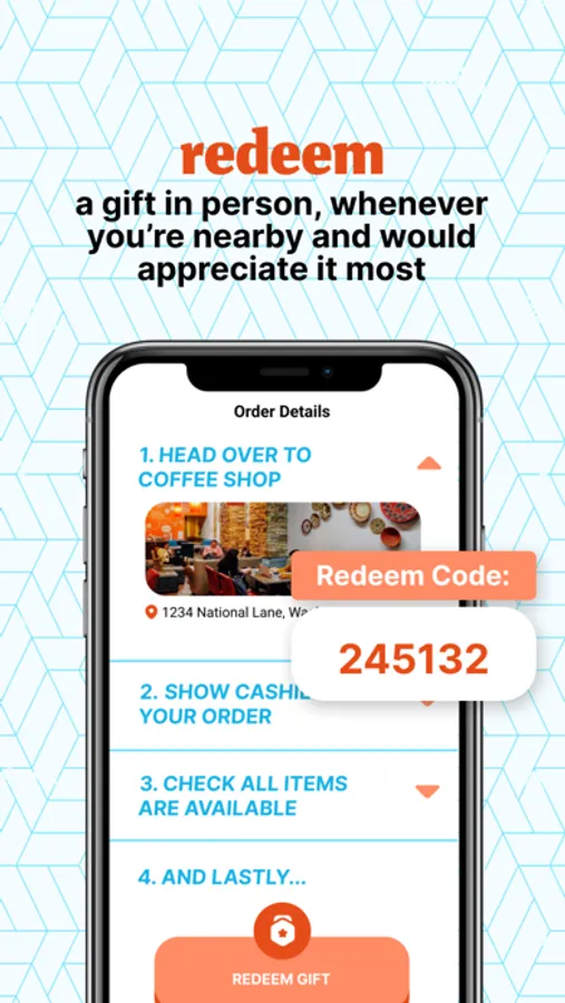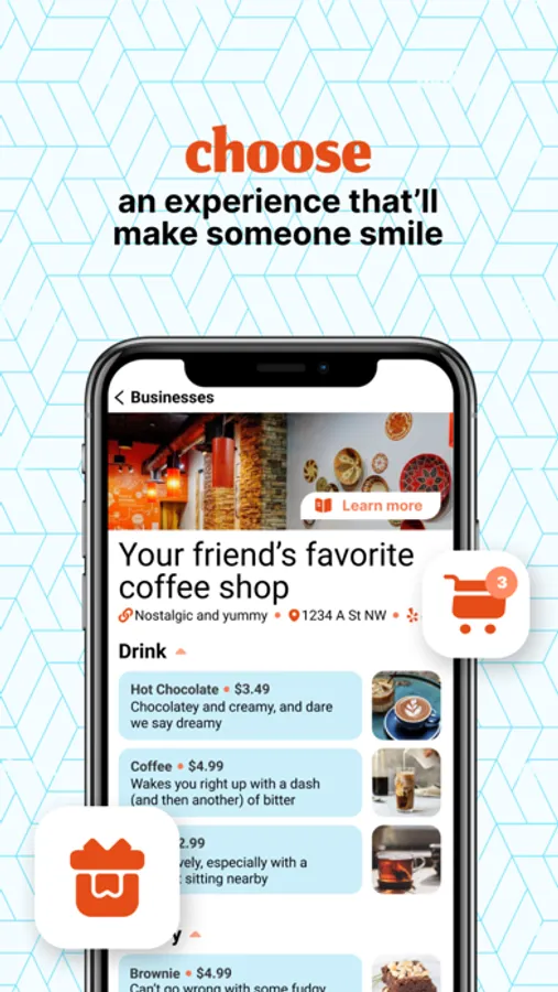 How does it work? Happy you asked! Explore local spots, choose a thoughtful gift, write out a kind message, and send the recipient a redeem code that they can use to savor the gift whenever they’re nearby, free, and would appreciate it most.