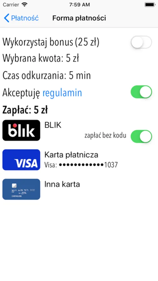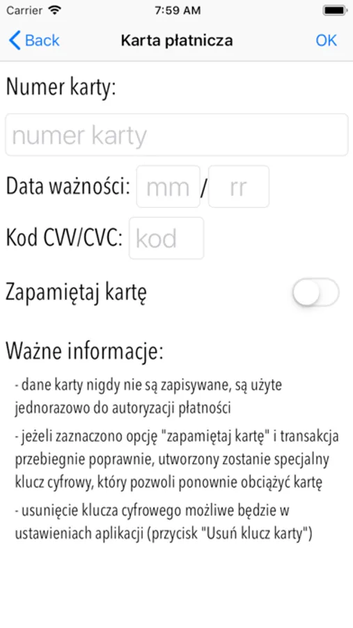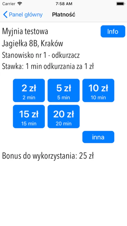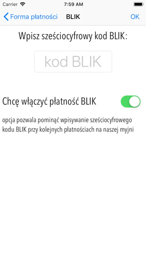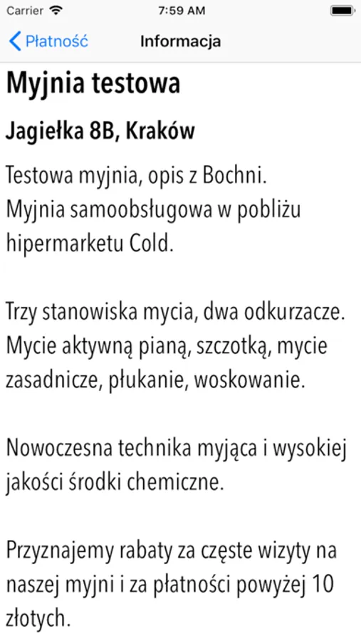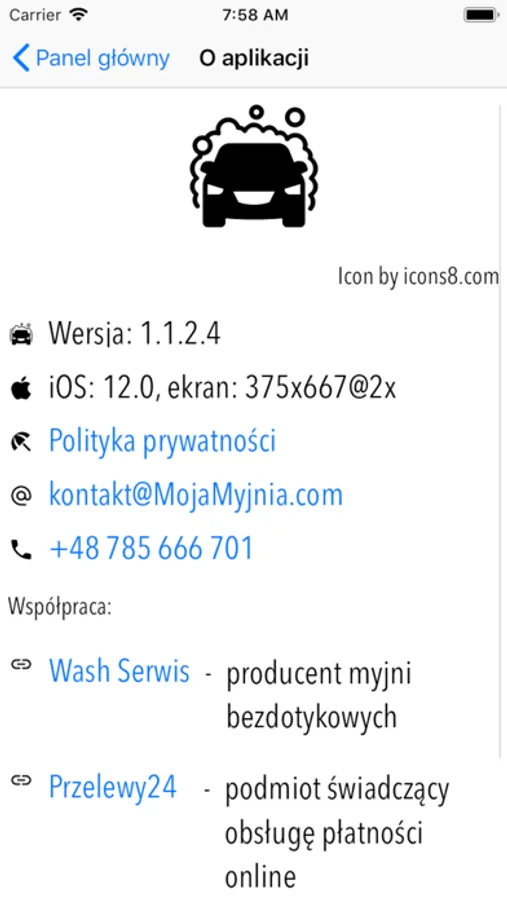 Aplikacja umożliwia dokonanie płatności bezgotówkowych na wybranych myjniach bezdotykowych firmy WASH SERWIS.