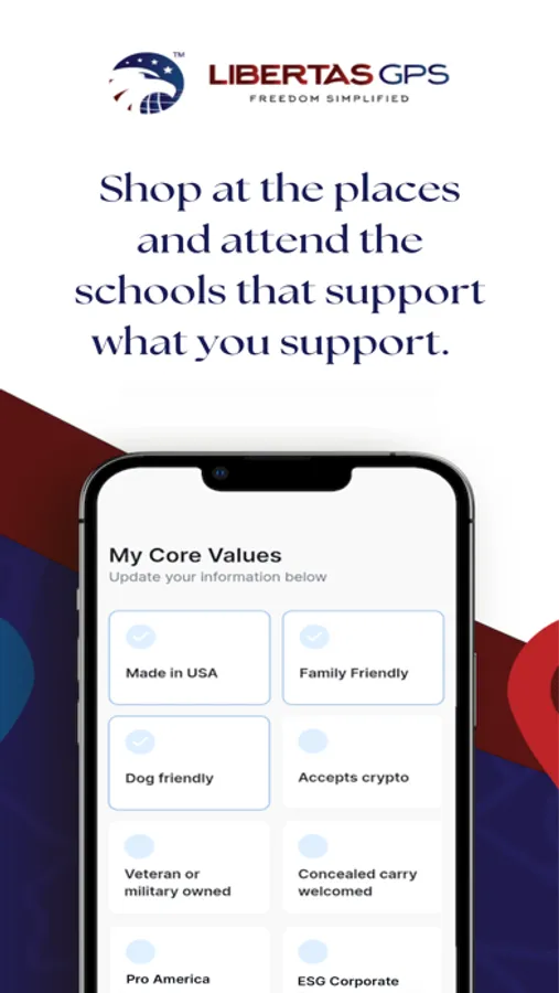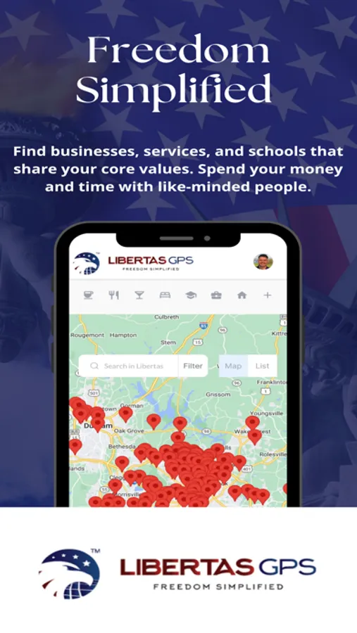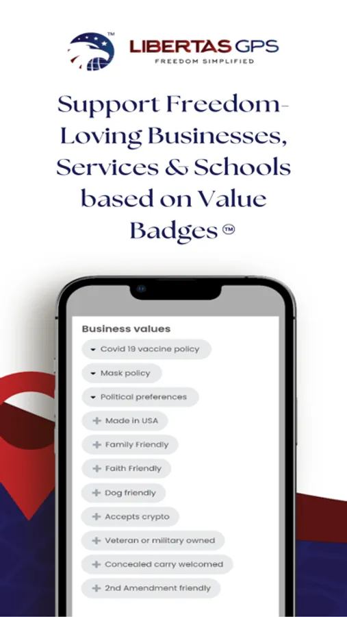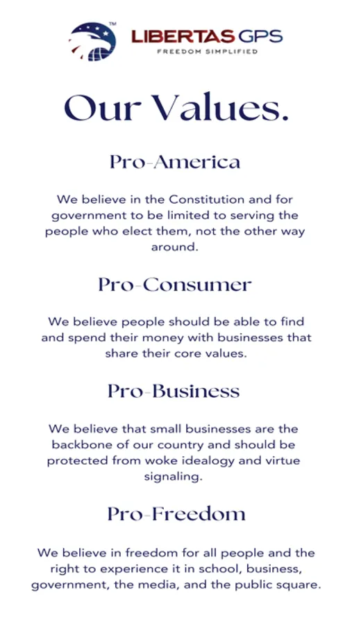 Welcome to Libertas GPS: the place where people go to find businesses, services and schools that share their values. Libertas GPS allows members to select a business or school based on 20+ individual Value BadgesTM. Get great products and discounts by joining the mission today!