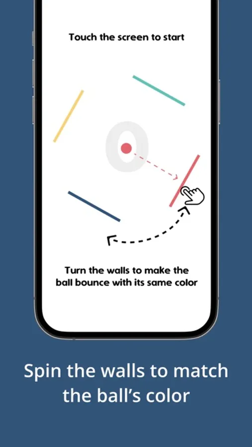 The game involves a ball and four straight walls of different colors surrounding it. The objective is to bounce the ball against the walls, but it can only bounce against a wall of the same color. The player earns a point each time the ball bounces against the correct wall, and the ball changes color with each bounce. If the ball hits a wall of a different color or goes out of bounds, the game ends. The player must move the walls to make the ball bounce against the correct wall and score points.