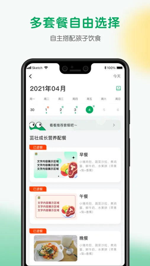 2、菜谱管理:用户在APP上实时查看每天的菜谱、荤素营养搭配情况。