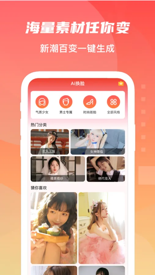 AI换脸换装是一款热门的智能ai换脸换装视频软件,你将会看到各种的视频特效换装视频模板,不管是古装古风汉服,56个民族服装、经典港风、旗袍美人,魅力男神,喜欢哪个都可以一键制作,只需要一张照片,即可生成各式各样的热门特效视频。用AI换脸,做一个丰富又好看的视频,只需要几秒钟,轻松一点马上生成热门特效视频!让你足不出户,轻松体验各类穿搭造型。
