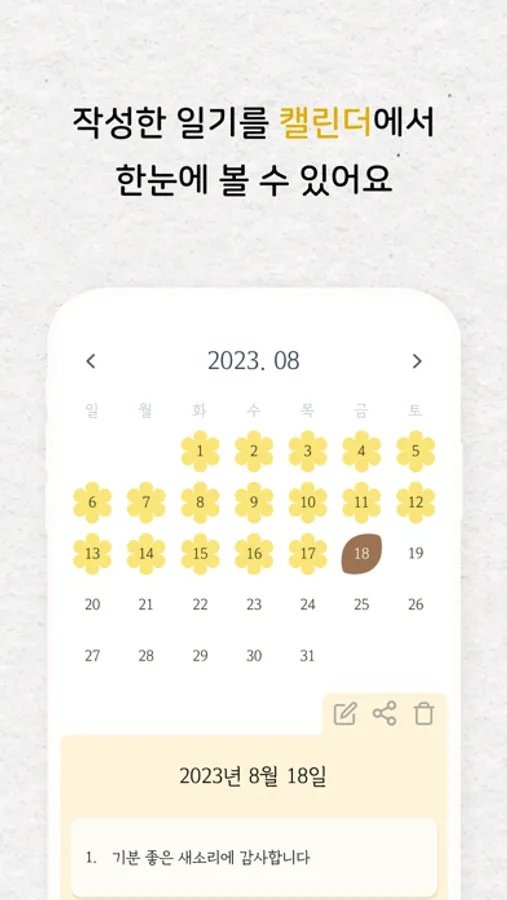 : 달력으로 작성 날짜와 내용을 한눈에 파악할 수 있어요.