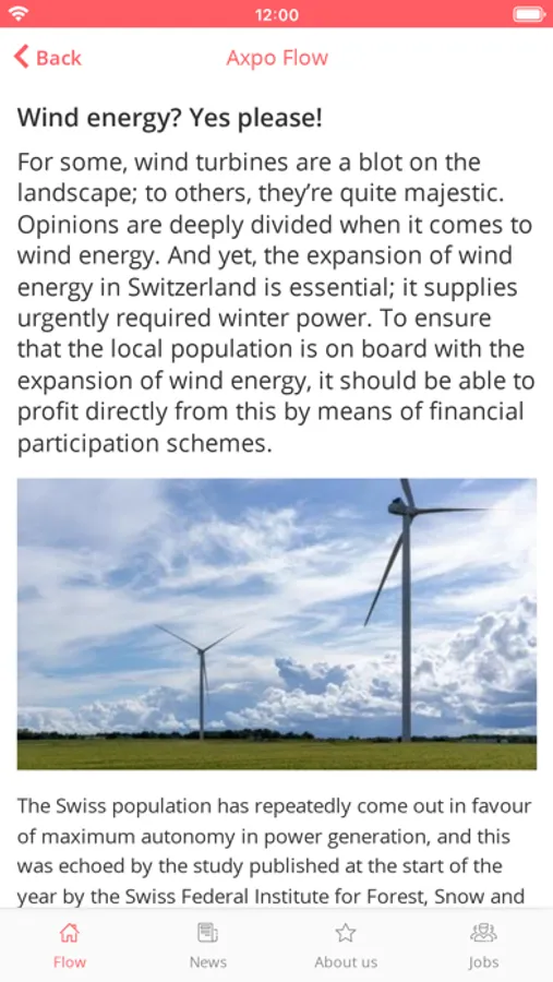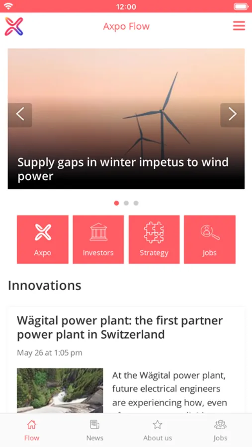 The Axpo Flow App is the communication app of Axpo. Just like our energy, communication flows with Axpo Flow constantly to our stakeholders, providing up-to-date information and news for employees, customers, partners, and interested parties. Stay connected with us and learn more about the world of Axpo.