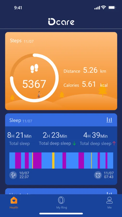 Dcare is the software that works with the smart ring. The data content obtained by the smart ring tracking will be displayed in the software in a timely manner. The software will detect and evaluate the user's exercise data and various health data based on the obtained content, and draw various intuitive charts to help users better and easily understand and adjust their daily life status.