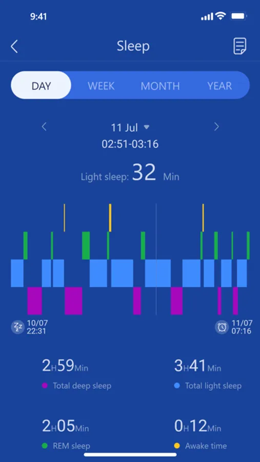 Records the user's sleep status, clearly shows the user's daily sleep and wake-up time, total sleep time, deep sleep time, light sleep time, REM time , and intuitively counts the percentage of deep sleep and light sleep to the total sleep time, to comprehensively and fully evaluate the user's sleep.