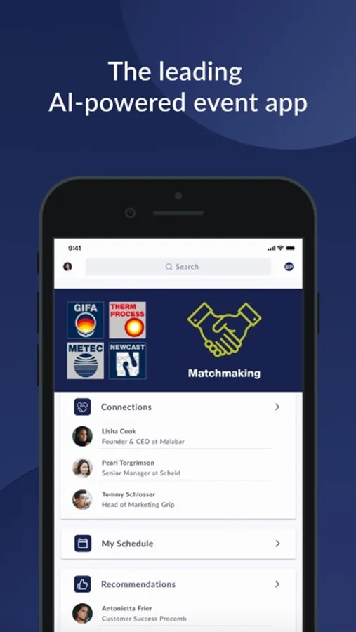 The self-learning matchmaking app selects the most relevant participants for you in order to start networking, arrange appointments and get to know trade fair participants. Every time you use the app, your contact recommendations will get more and more precise because of our self-learning system.