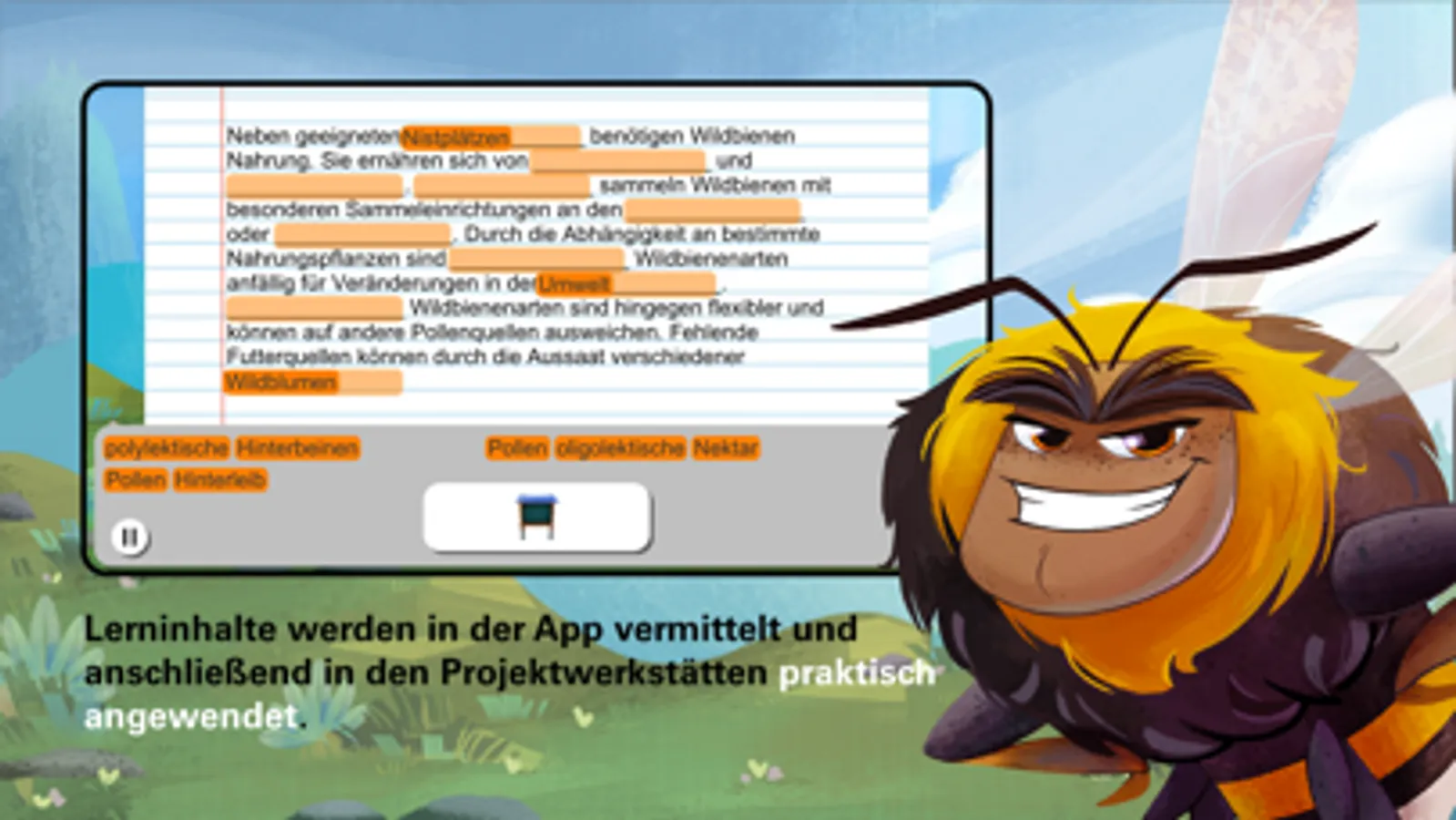 Mit interaktiven Spielen, Quizfragen und Rätseln, die Kindern die Bedeutung der Wildbienen näher bringen, macht Lernen Spaß. Sammeln Sie Punkte und beobachten Sie, wie Ihr Wissen durch die verschiedenen Levels steigt.