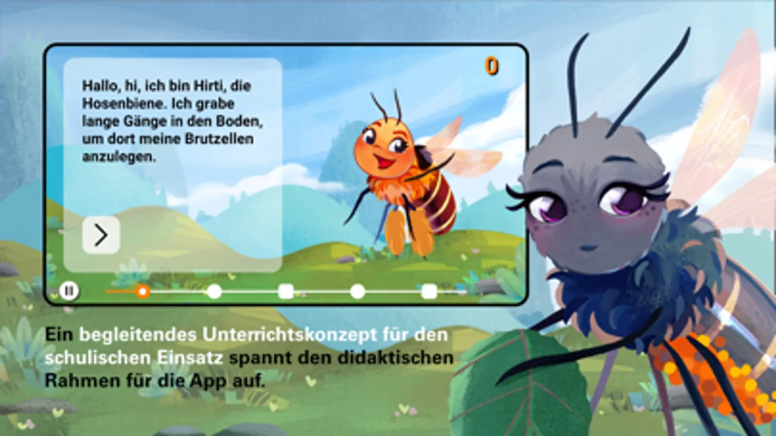 Treffen Sie die Bienencharaktere: Begeben Sie sich auf eine aufregende Reise mit sechs liebenswerten Wildbienencharakteren, jeder mit seiner eigenen Persönlichkeit und seinen eigenen Eigenschaften. Die Kinder erkunden die virtuelle Welt an der Seite ihrer charmanten Bienenfreunde und lernen etwas über ihre Aufgaben, Verhaltensweisen und Lebensräume.