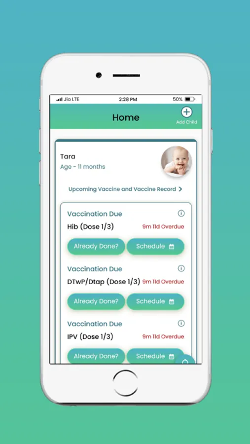 To get started, you need to add your child's details to the app and let the personalised schedule & reminders flow through to you.