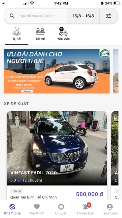 Ứng dụng cung cấp giao diện tìm kiếm thông minh, cho phép người dùng nhập địa điểm, thời gian và loại xe mà họ muốn thuê.