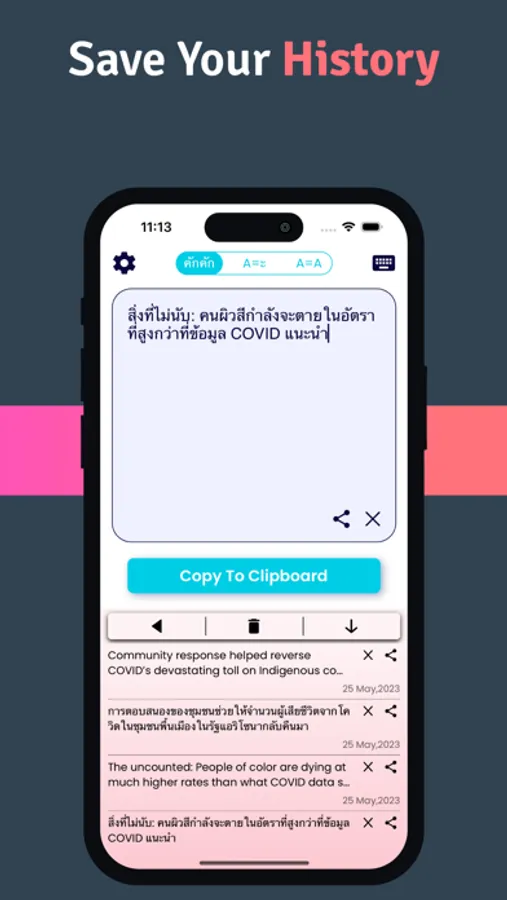 You can save your Thai text inside application it self. You can use your text for later use too.