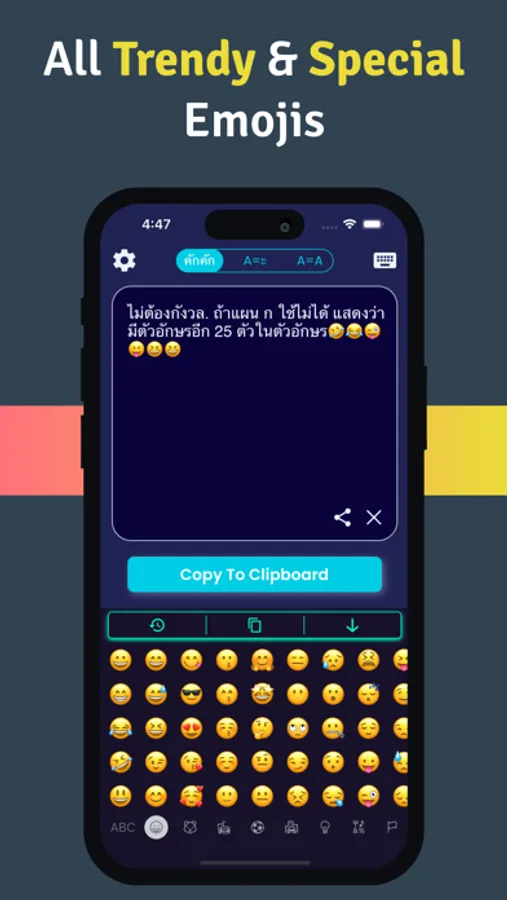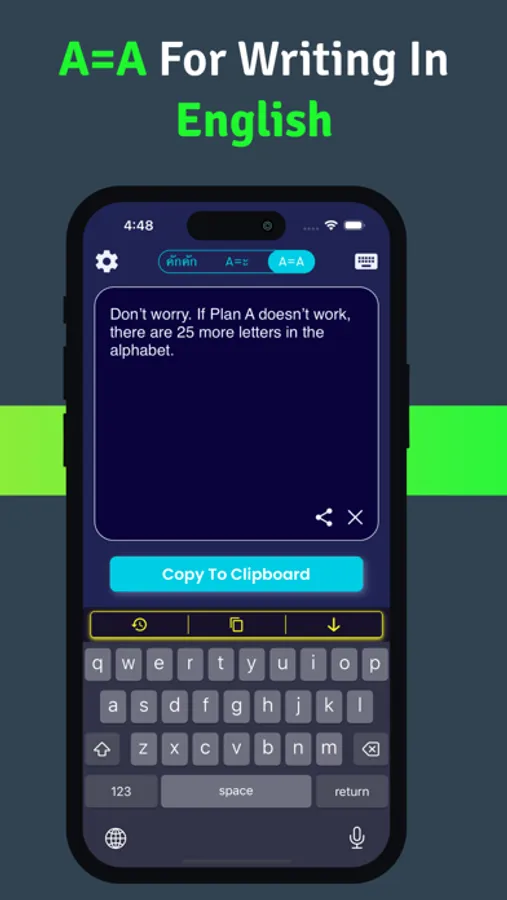 Easy and fast Thai typing is the first priority of this Thai Keyboard. Besides direct Thai typing pad, it also supports phonetic avro style typing. This keyboard helps you typing Thai very fast with Thai letters with A = Thai latter .