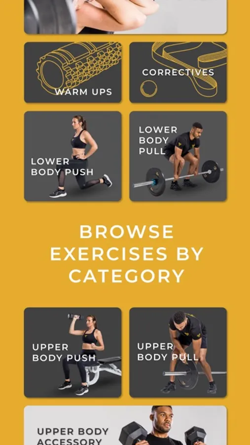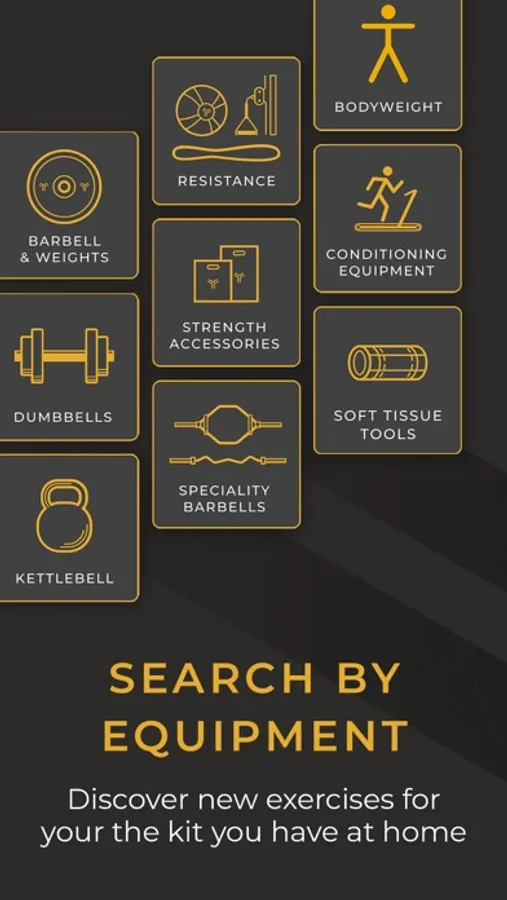 - Browse exercises by equipment, category or search using keywords.