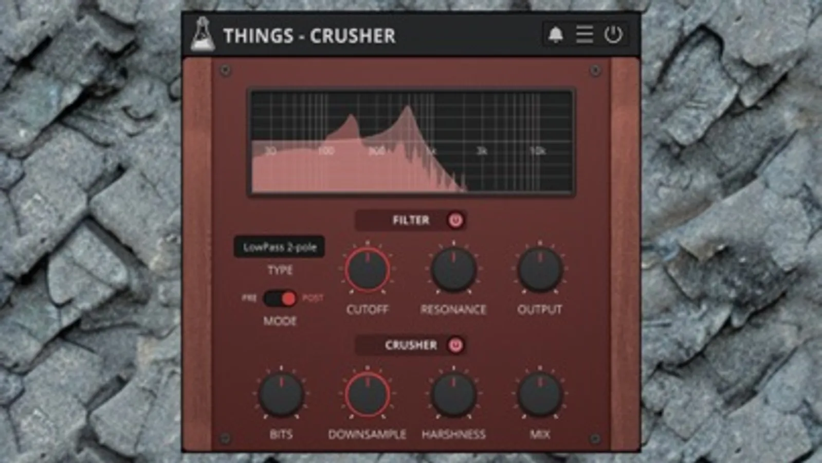 Crusher features a multimode filter (lowpass, highpass, bandpass, notch) with 2 or 4-pole and an output gain, along with a crisp bit crusher (bits, downsample, mix) paired with a harshness control taken from our plugin Reels.