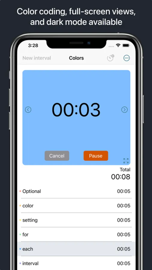 Choose to run your timer in a detailed view that auto-scrolls through intervals or a full-screen mode for a larger, easily visible display. Both modes support portrait and landscape orientations.