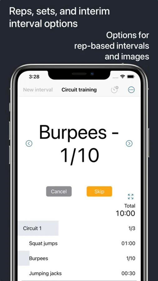 Set an interim intervals that will automatically be added between intervals. Optionally, end your timer with the interim interval. Skip or backtrack through intervals using intuitive arrow buttons. Swipe actions allow for easy deletion and duplication of intervals and sets.