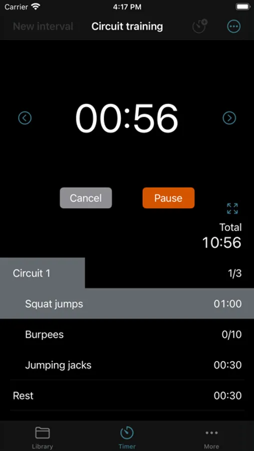 View countdown of each interval and total remaining time, with an option to display total elapsed time.